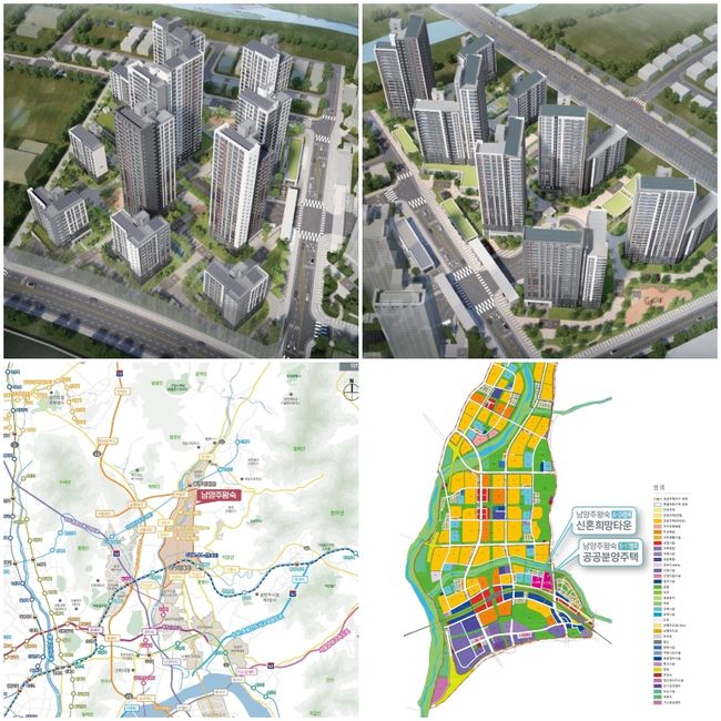 사진 왼쪽 위로부터 남양주왕숙 A-24블록 조감도, 남양주왕숙 B-17블록 조감도, 남양주왕숙 토지이용계획도, 남양주왕숙지구 위치도