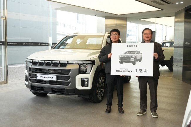 KGM은 지난 19일 KGM 익스피리언스 센터 일산에서 KGM 권교원 사업부문장(전무)을 비롯한 임직원들이 참석한 가운데 `무쏘` 1호차 전달식을 진행했다.