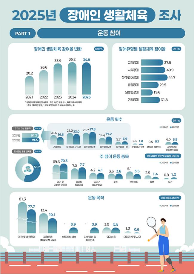 이번 조사는 전국 등록 장애인 1만 명을 대상으로 진행됐으며, 주 2회 이상, 1회당 30분 이상 집 밖에서 운동하는 ‘생활체육 완전 실행자’ 비율은 34.8%로 집계됐다. 이는 전년 대비 0.4%포인트 감소한 수치다.