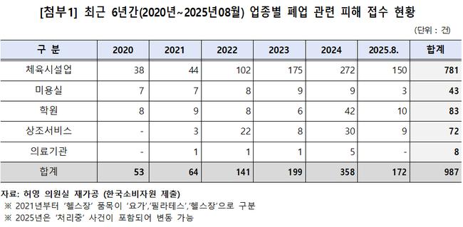 국회 정무위원회 소속 허영 의원(더불어민주당·춘천갑)이 공정거래위원회와 한국소비자원으로부터 제출받은 자료에 따르면, 2020년부터 2025년 8월까지 접수된 폐업 관련 선불거래 피해 구제 신청 건수는 총 987건, 피해 금액은 2억1,295만 원에 달했다. 이는 공식 접수된 건수만 집계한 것으로, 실제 피해 규모는 훨씬 클 것으로 추정된다.