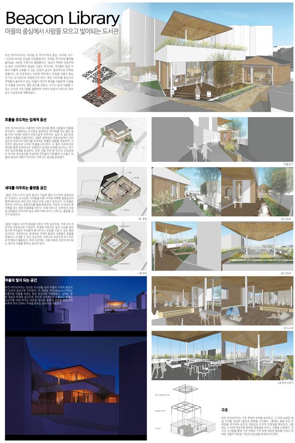 대상작 ‘Beacon Library’는 서울 강북구 미아동의 빈집을 마을 도서관으로 재해석한 작품이다. 낮에는 투명한 정원 형태로 개방감을 주고, 밤에는 따뜻한 조명으로 골목을 비추는 등대처럼 설계돼 심사위원단으로부터 높은 평가를 받았다.