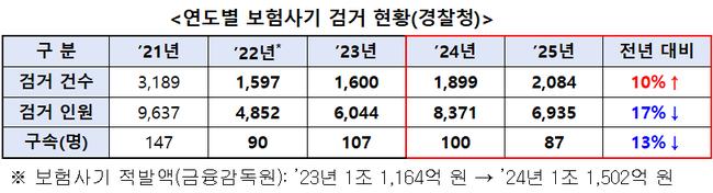 경찰청 통계에 따르면 보험사기 검거 건수는 2021년 3,189건에서 2025년 2,084건으로 증가세를 보였다. 같은 기간 검거 인원은 9,637명에서 6,935명으로 줄었고, 구속 인원도 147명에서 87명으로 감소했다. 다만 금융감독원 집계 보험사기 적발액은 2023년 1조 1,164억 원에서 2024년 1조 1,502억 원으로 늘어 범죄 규모의 대형화가 확인됐다.
