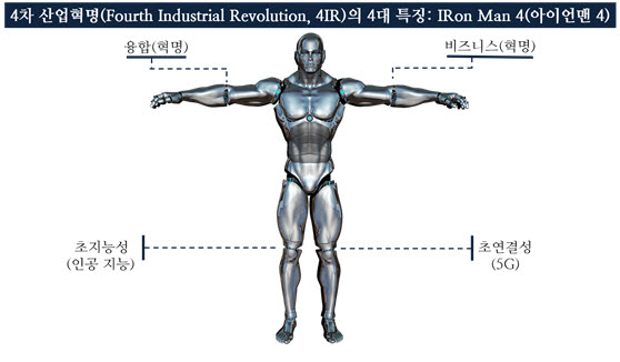 문형남 교수는 4차 산업혁명 4대 구성 요소를 명확하고 쉽게 눈에 보이게 도식화했으며, 이를 ‘아이언맨 4(IRon Man 4)’라고 명명하고, 14일 처음으로 공개했다.
