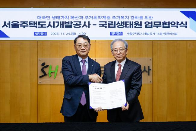 서울주택도시개발공사(SH, 사장 황상하)와 국립생태원(원장 이창석)은 대국민 생태 가치 확산과 주거 복지 강화를 위해 24일 업무협약(MOU)을 체결했다고 밝혔다.